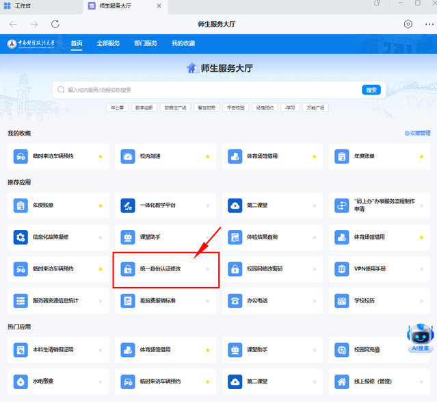 自助修改密码:点击登录界面忘记密码,根据提示步骤通过之前已绑定的手机号或邮箱找回,也可以通过“企业微信-师生服务大厅-统一身份认证修改”找回,如下图所示: